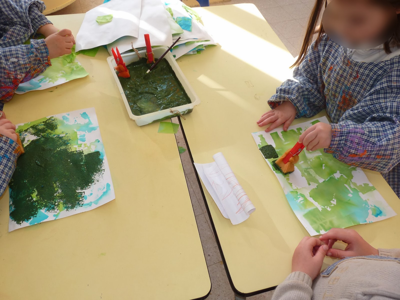 Lors de la deuxième étape, les enfants ont peint le feuillage des arbres avec une éponge.