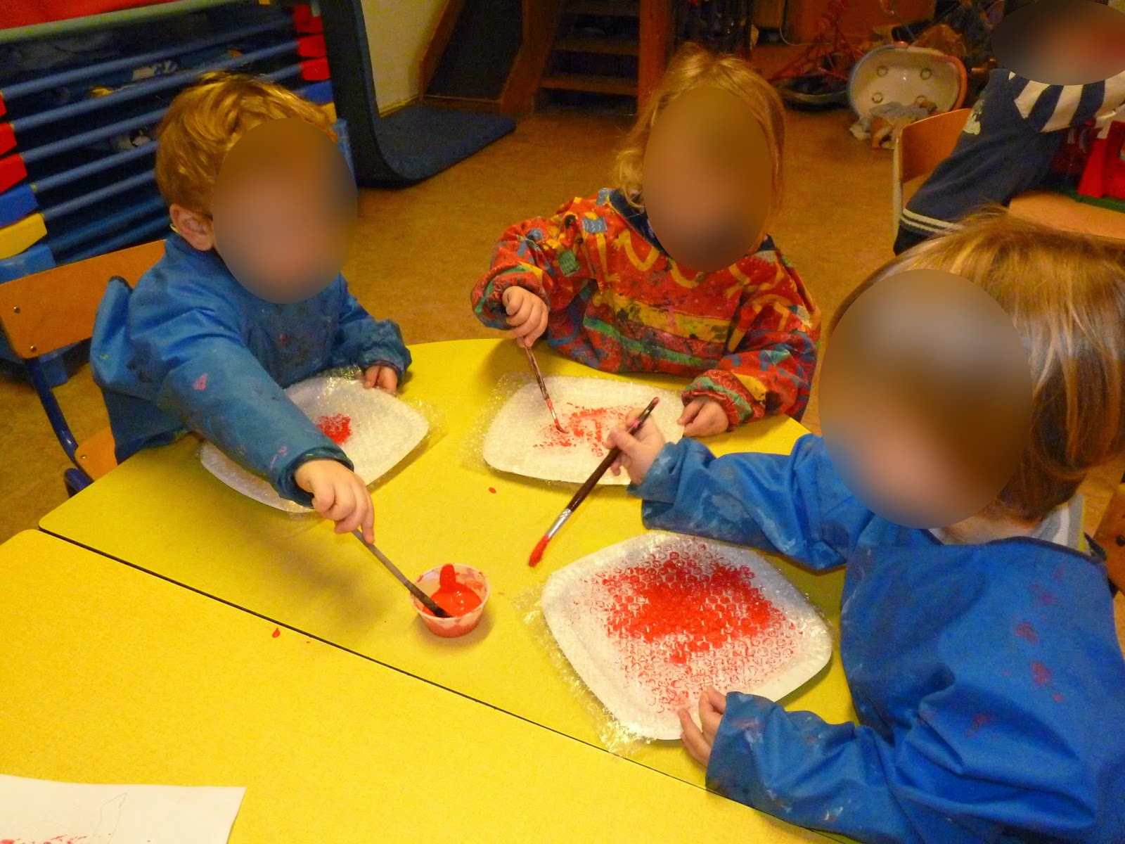 Peinture à la fourchette. On étale d'abord de la peinture avec un pinceau. Ensuite, nous réalisons des petits dessins avec une fourchette.Puzzle géant de la princesse.