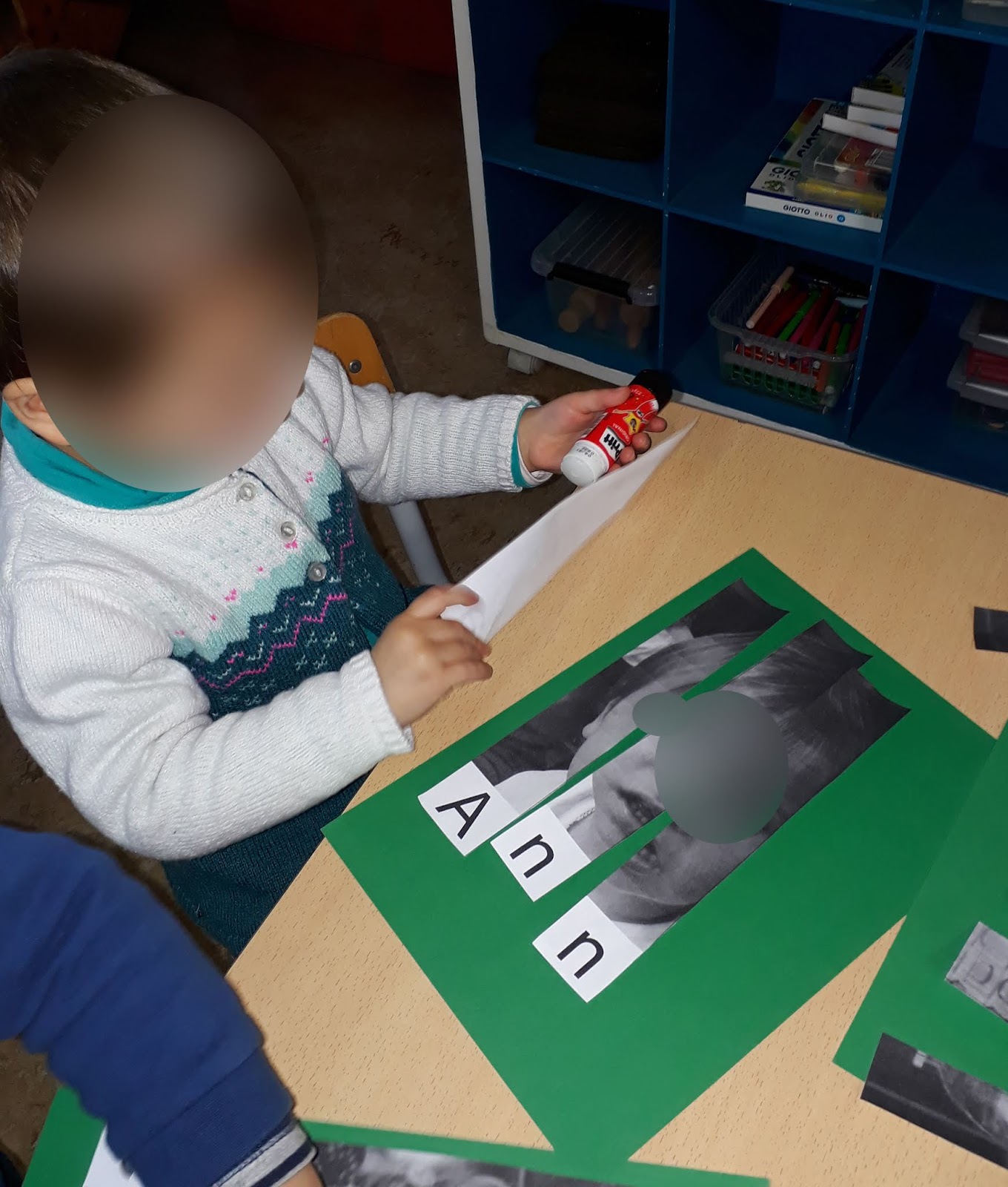 Les enfants reçoivent leur portrait découpé en bandelettes. Leur prénom est écrit sous le portrait. En mettant les bandelettes dans le bon ordre, le prénom est écrit correctement.